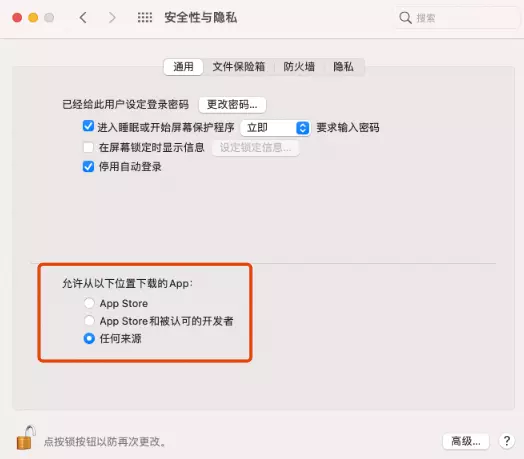 - 先打开 安全性与隐私 检查是否有 任何来源 选项